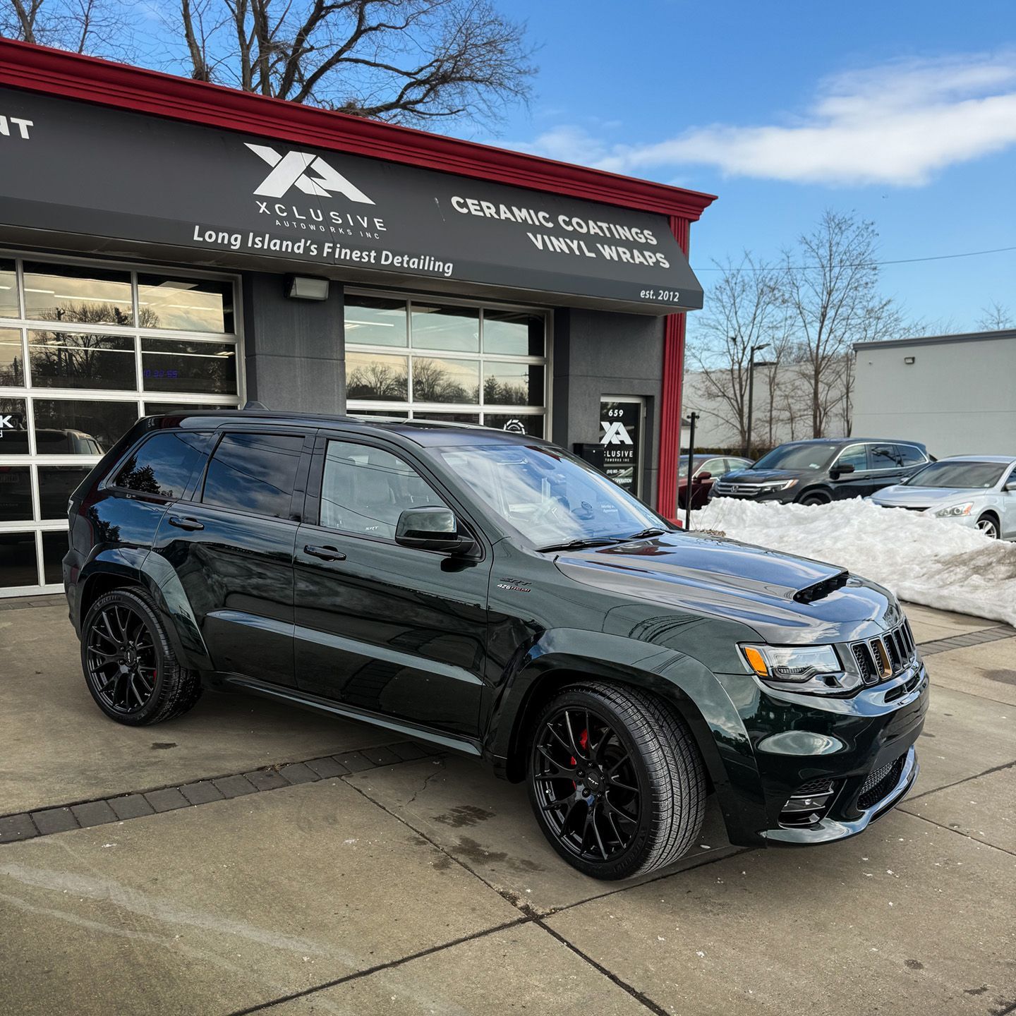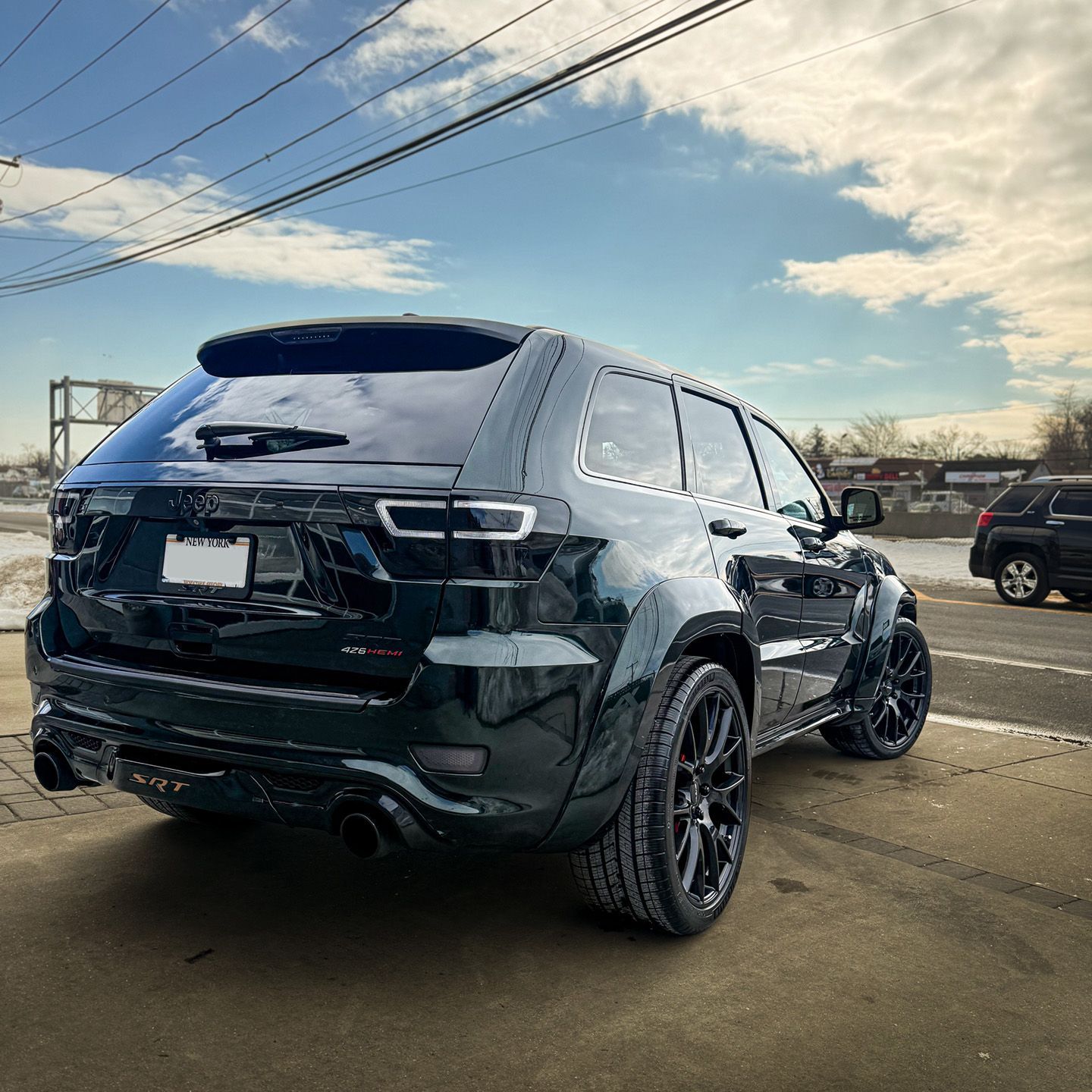 As it pulls away from the shop in West Babylon, the gloss deepens under the shifting light. The reflections stretch long across the pavement. The exhaust note remains unmistakably SRT but the visual presence has evolved.